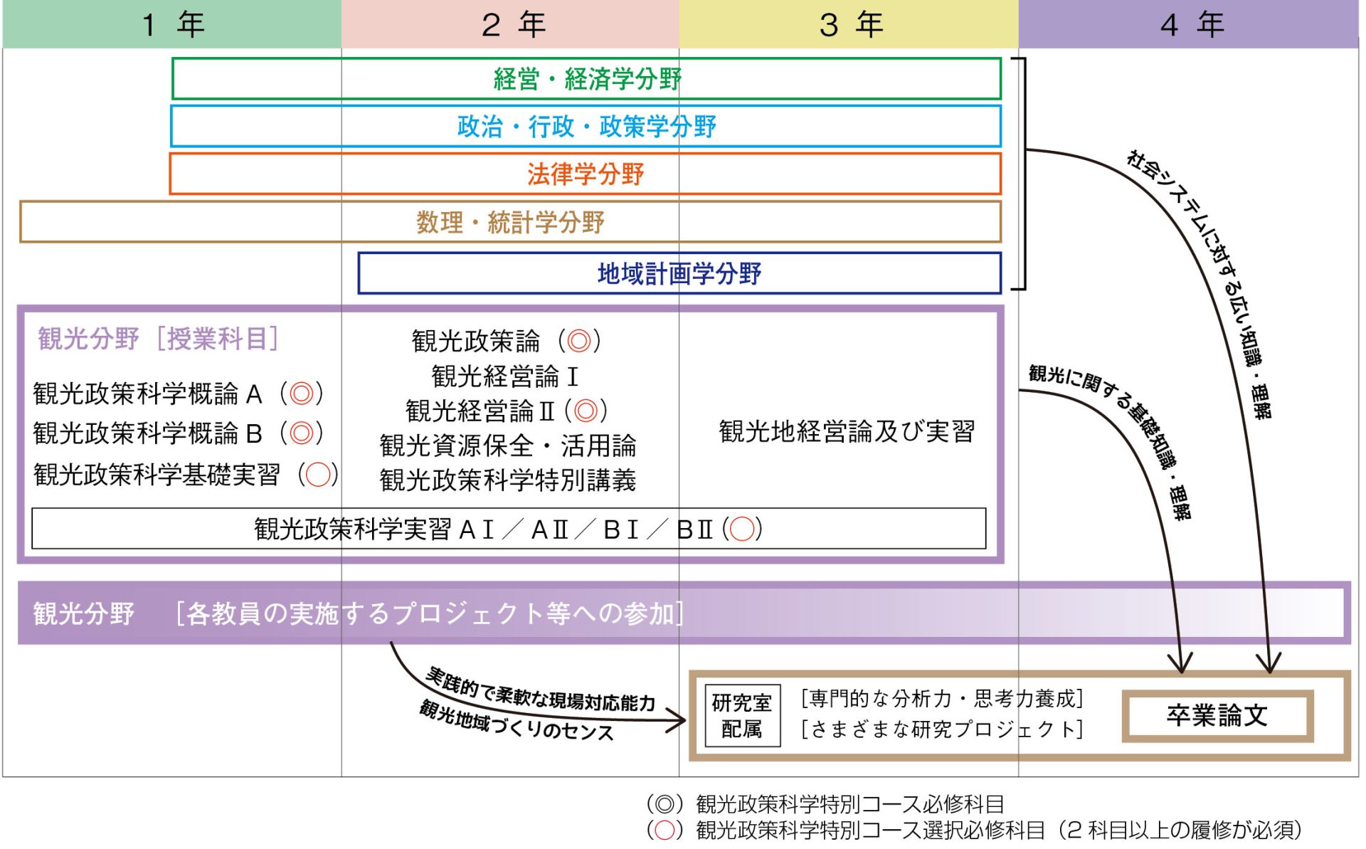 観光政策科学特別コースの学生は、地域社会システム学科の必修科目に加えて、下図に示す◎のすべて及び◯のうちの2科目(選択)が必修科目となり、卒業までに必ず履修し、単位を修得する必要があります。