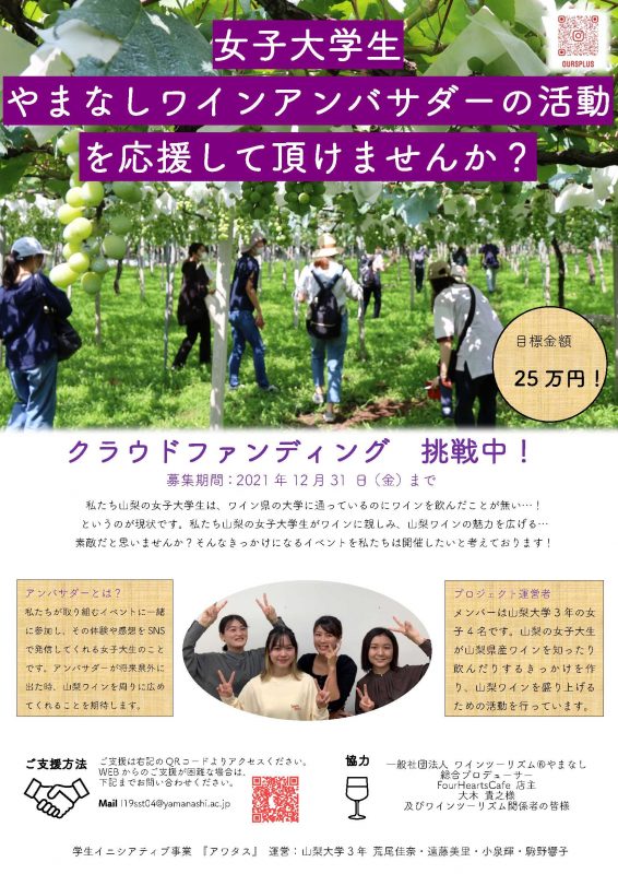本プロジェクトでは、活動計画の実現のために、クラウドファンディングに挑戦し、県内の女子大学生向けにワイン研修やテイスティングイベントなどの開催に向けて取り組んでいます。