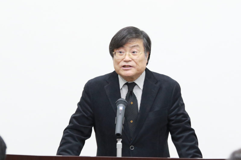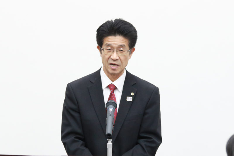 島田眞路 学長及び弦間正仁 県観光部長による開会挨拶の後、武川清志朗(公社)やまなし観光推進機構マネージャーが講演し、県内での様々なアニメ関連イベントの経緯や実状等を報告した上で、観光客の受入には地域の理解・協力を得ることが必要と述べました。