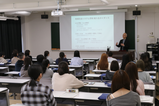 学科長、1年生担任の挨拶につづき、履修計画の立て方、履修申告の方法など、今後の大学生活を送るうえで重要な内容について説明を行いました。
