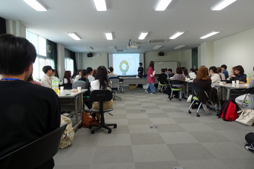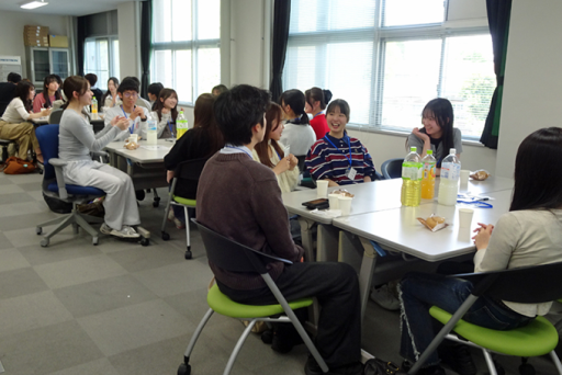 新入生は8グループに分かれて、先輩と一緒にお弁当やデザートのシュークリームを楽しみました。各グループでは他己紹介を行い、クラス全体ではルーレットで選ばれた学生による自己紹介も行われました。終始和やかな雰囲気の中で親睦を深めることができました。